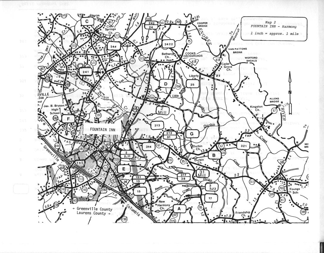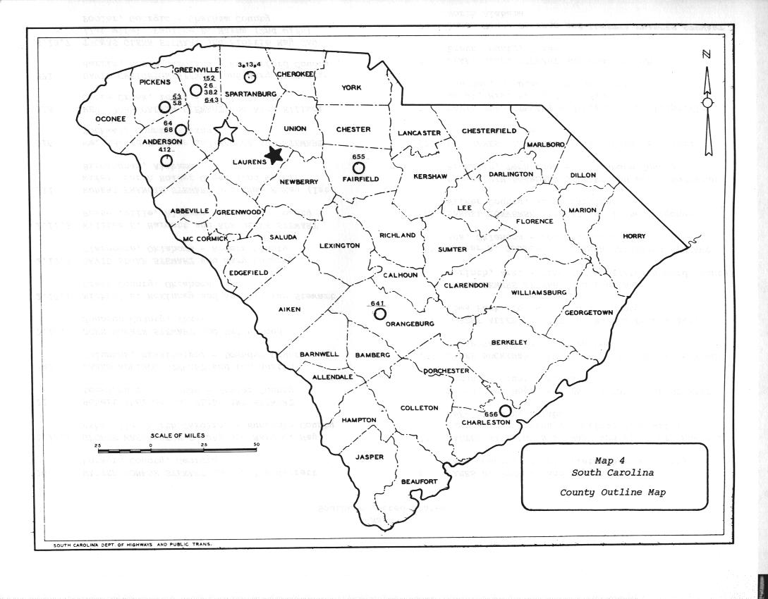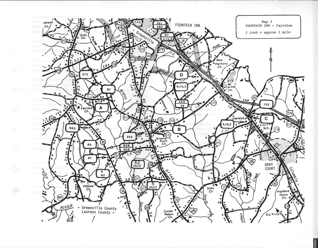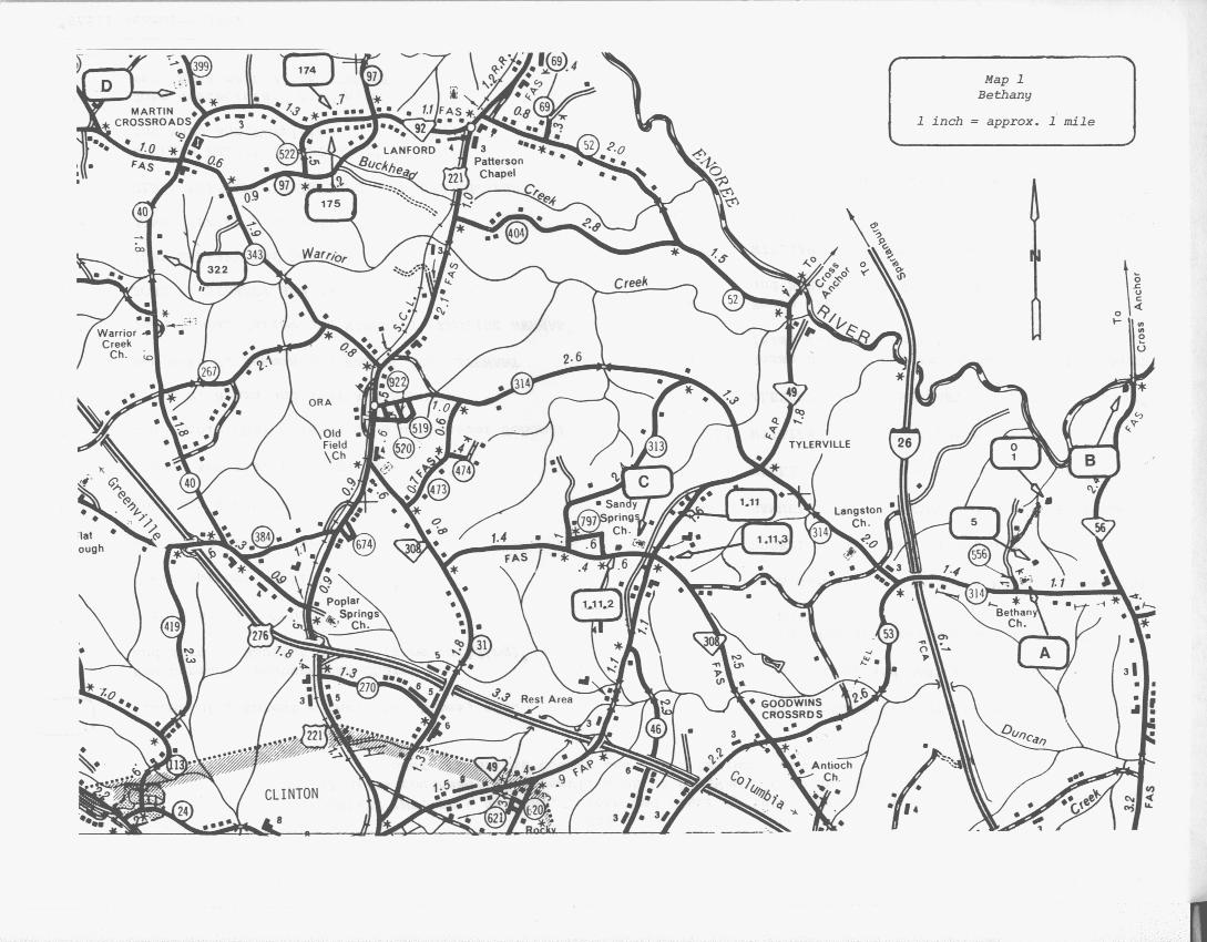 Walter Stewart Family Maps and LocationsThere are a great number of locations, landmarks, and homes related to the Walter Stewart Clan in the upcountry area of SC. Some locations are approximate because the buildings are no longer standing, while other locations, such as homes and churches, are still standing, and are slightly more accurately marked. Below are scans of maps from the appendix of the 1982 book, The Walter Stewart Family History. Below that is a Google Map that attempts to reproduce the locations from Maps 1-3 in a more accessible format. There are also photos and videos of some of the locations, contributed by 151222 John Hellams and 351231 LaMarr Brooks. Each location below is linked to an album. Some other related photos are published in the Photos area of the website, specifically in the Saturday 2009 album. The Original Maps